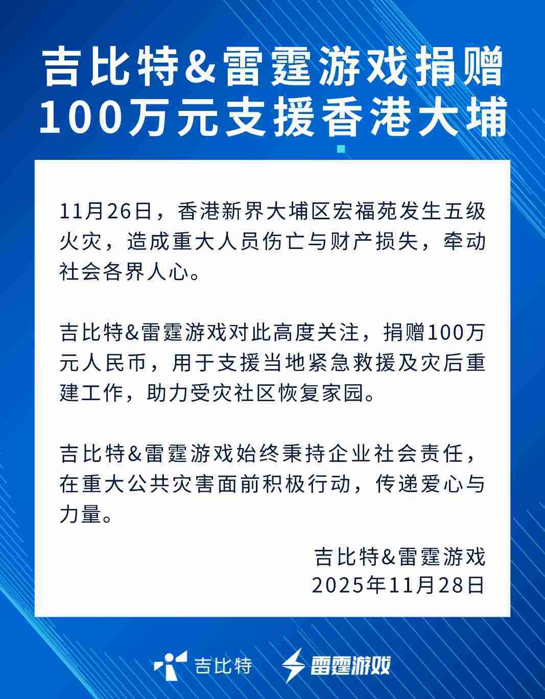 公司新聞 一競技&雷霆游戲捐贈100萬元 支援香港大埔火災救援及災后重建